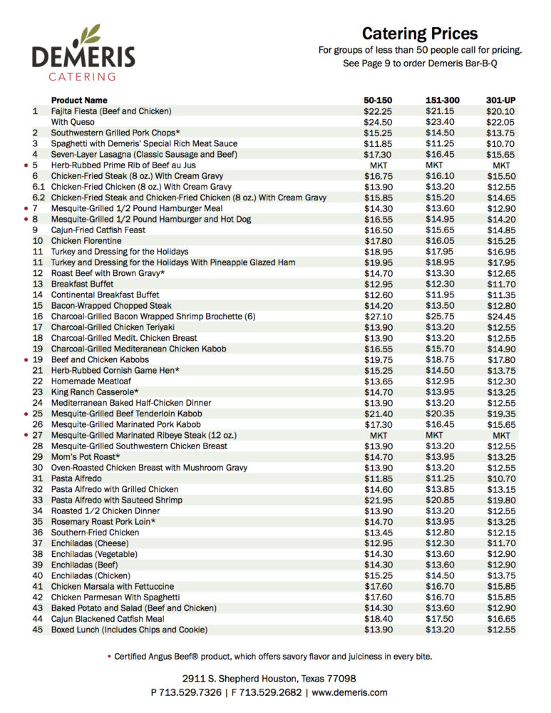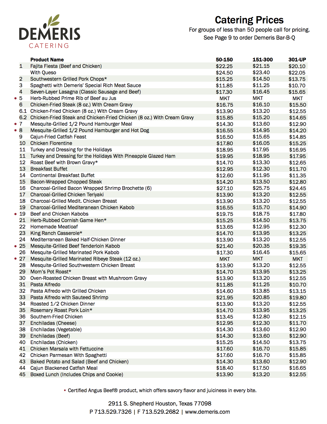 Catering Prices Catering PricesPlease note: For groups of less than 50 people, call for pricing or to schedule a consultation with our catering and events specialists, please call us at 713-529-7326.Just looking for bar-b-q? Click here for our bar-b-q menu.Download the full Demeris Catering Menu